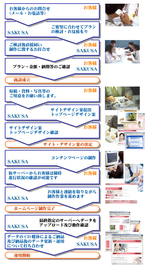 お客様には随時途中状況を報告します。また、雛形が出来上がった時にテスト用HPにデータをアップしますので、お客様の目で直接確認することができます。